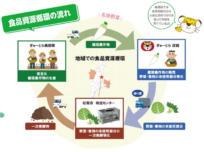 「ほらへん」は松阪市にある流通センターに配置し、ここに11店舗から出た未使用部分を集約して、導入した食品残さ発酵分解装置を用いて肥料(一時発酵物)を生産しています。生産した肥料はぎゅーとら農援隊に販売し、肥料として使用、生産された農産物はぎゅーとらが仕入れ、お客様に販売しています。
